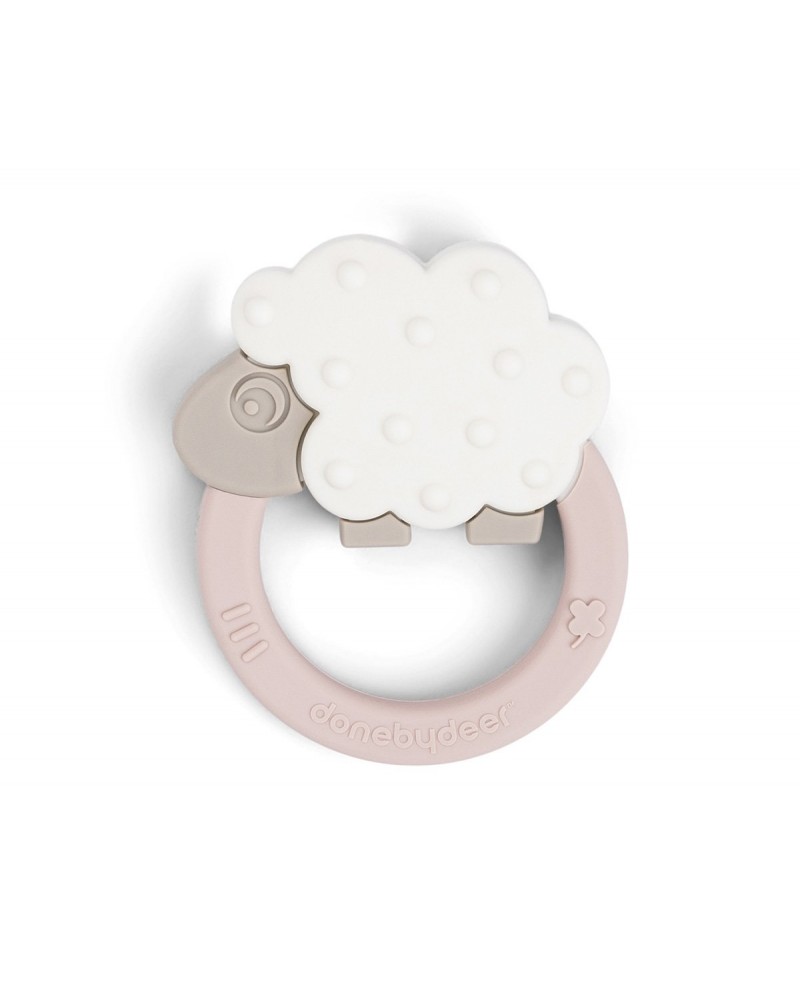Mordedor de la dulce ovejita Sheepy de la colección Tiny Farm de Done by Deer. Es fácil de sujetar, tiene diferentes formas y texturas para estimular y aliviar el dolor de sus encías.