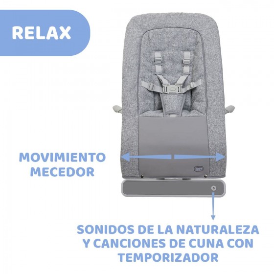 La suave música de la hamaca entretiene y relaja al bebé. También puedes configurar un temporizador eligiendo entre una duración de 10 o 30 minutos. En el caso de la primera opción, para reactivar el sonido solo tendrás que dar un ligero golpe al respaldo.